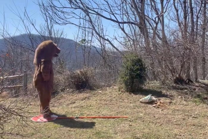 Прежде чем он подошёл слишком близко, чёрный медведь, похоже, испугался. Он убежал, но не раньше, чем остановился на краю участка, чтобы посмотреть на своего искусственного двойника, прежде чем сдаться и вернуться в лес.