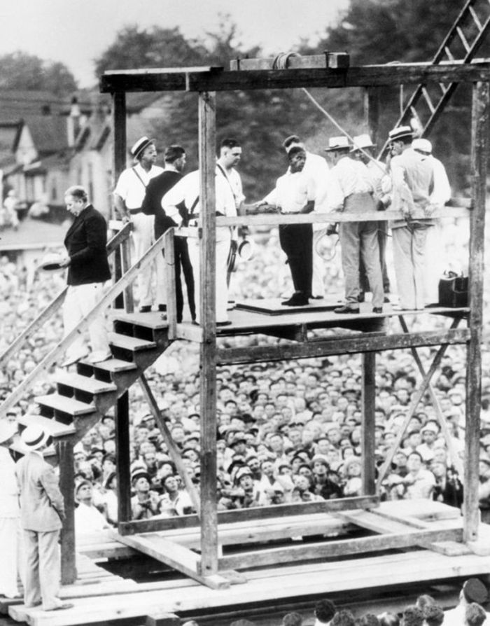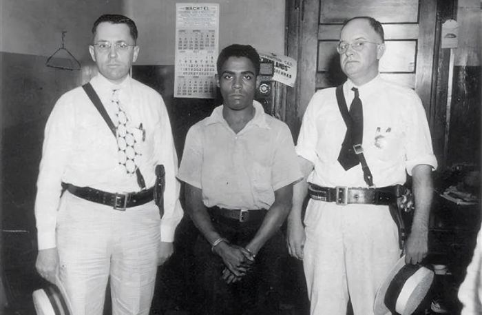 14 августа 1936 года, Рэйни Бетеа сфотографирован с помощниками шерифа Альбертом Риссом и Лоуренсом Дишманом, когда они покидают тюрьму округа Джефферсон в Луисвилле, для его казни в Оуэнсборо (Фото AP Photo / Owensboro Messenger-Inquirer)