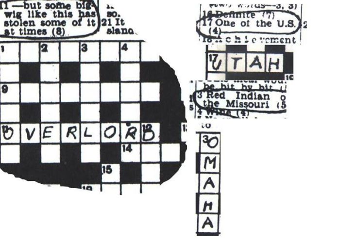 Среди ответов на кроссворд были слова «Юта» и «Омаха» — так Союзники называли французские пляжи, на которые должны были десантироваться американские военные. Другое слово, «Малберри», совпадало с названием системы береговых сооружений, которую британцы собирались использовать для выгрузки техники, людей и ресурсов. Подсказка «воротила» в кроссворде указывала на слово «Оверлорд». Так называлась вся операция по освобождению севера Франции. Наконец, последнее слово, «Нептун» совпадало с названием первой фазы операции, то есть с высадкой в Нормандии.
