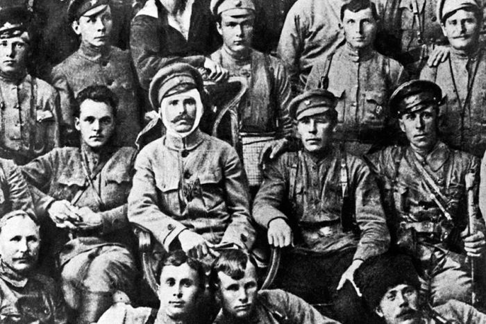Чапаев (с повязанной головой), слева от него Фурманов, прямо внизу - Петр Исаев
