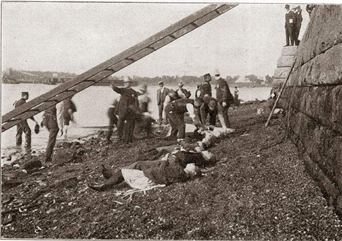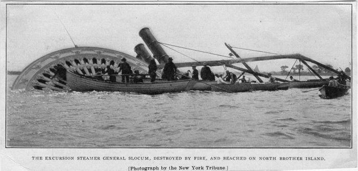 15 июня 1904 года в 10 часов утра жители Нью-Йорка стали свидетелями невероятного и страшного зрелища. В самом центре города по реке Ист-Ривер на огромной скорости шел охваченный огнем большой белый пароход. С бешеной скоростью в клокочущей пене воды вращались его гребные колеса, за кормой по реке стелился черный шлейф дыма, а на переполненной верхней носовой палубе под бравурную музыку оркестра пассажиры танцевали веселую польку…