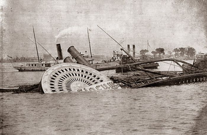 С такого странного, небывалого еще в истории города происшествия начался этот день, вписавший еще одну страшную страницу в летопись морских катастроф. Жителям Нью-Йорка было хорошо знакомо название горевшего парохода. На его гигантских колесах золотыми буквами сияло "Gnl.Slocum".