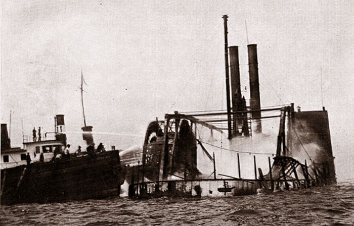 Первый помощник капитана Фланаган доложил капитану о пожаре лишь спустя двадцать минут после того, как об этом ему сказал матрос Джек Кокли. Увидев вырывавшиеся с нижних палуб за гребными колесами языки пламени и стелившийся за кормой дым, Ван-Шайк понял, что его судно обречено на гибель.