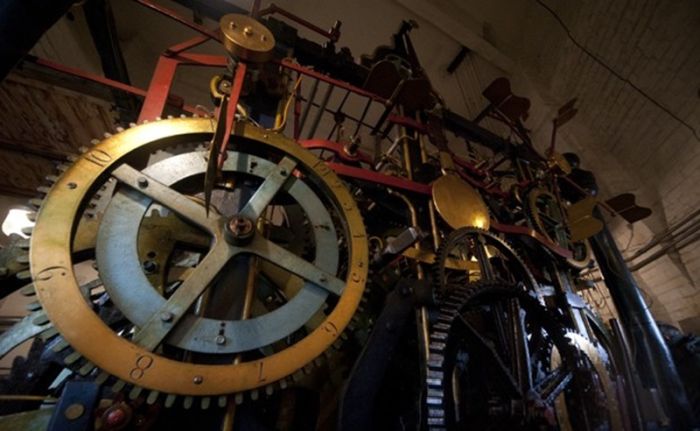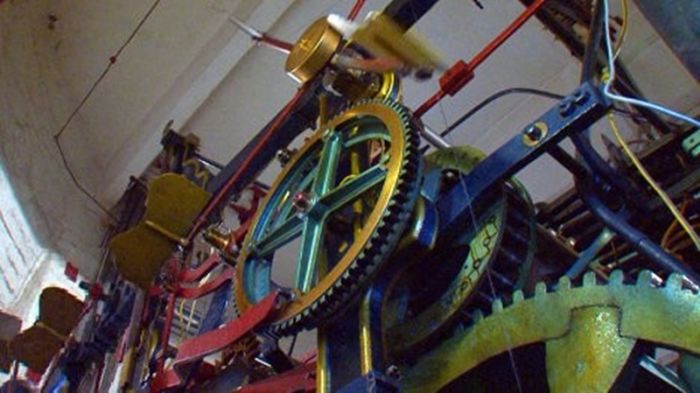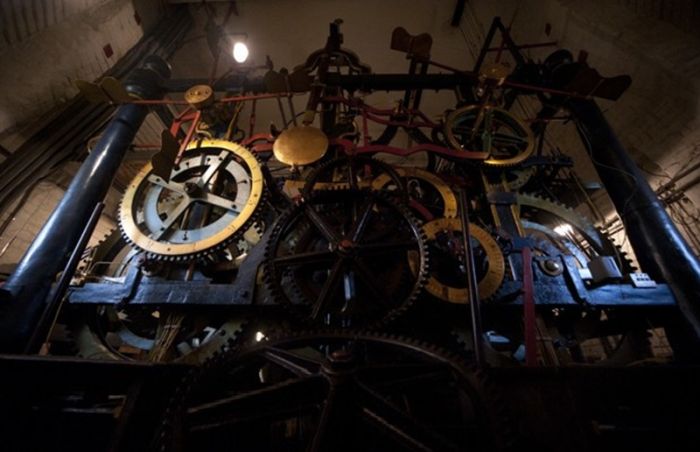 Каждая стрелка по 3 метра, сам циферблат — 6 метров. С брусчатки размер так не ощущается, но главные часы страны занимают несколько этажей. Больше человеческого роста колеса и шестеренки, огромный музыкальный барабан, 32- килограммовый маятник — итого вся конструкция весит больше 25 тонн. Во всем же остальном куранты самые обычные механические часы.