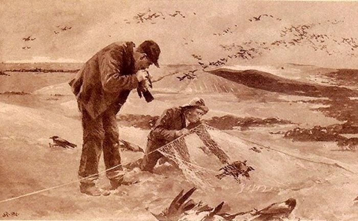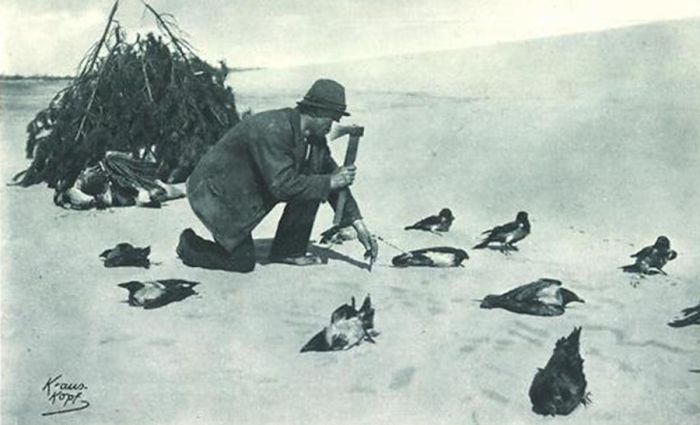Поэтому или сам охотник, или сопровождающие его мальчишки кусали птиц в шею, повреждая хребет, но оставляя в живых. Парализованные таким варварским способом пернатые спокойно лежали на мешковине, ожидая, пока добытчики не соберутся домой. Ловцов называли «воронокусателями» (Krähenbeißer или Krajebieter).