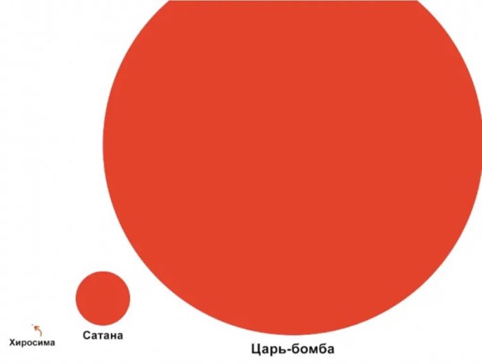 Но ведь это еще не все. Самая мощная из всех созданных бомб — Царь-бомба — имела мощность 58 Мегатонн. Это в 7 раз больше, чем у Сатаны и в 3800 раз больше, чем у Хиросимы. Вот кружки соответствующих диаметров.