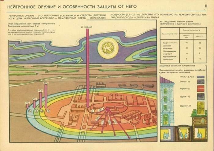 Нейтронная бомба представляла собой термоядерный боеприпас, который был спроектирован так, что при детонации на нейтронное излучение приходилось как можно больше энергии взрыва. В свою очередь, нейтронное излучение хорошо поглощается воздухом. Что приводило к тому, что радиус поражения нейтронным излучением был меньше радиуса поражения ударной волной, которая была неслабой при детонации нейтронного боеприпаса, что делало невозможно использовать этот тип боеприпаса как «оружие мародера». Данный тип оружия имел совсем другие задачи: эффективное уничтожение бронетехники противника, играл роль сверхмощного противотанкового средства и выполнял задачи в противоракетной обороне. Что привело к созданию разных мер по защите от нейтронного излучения.![]()