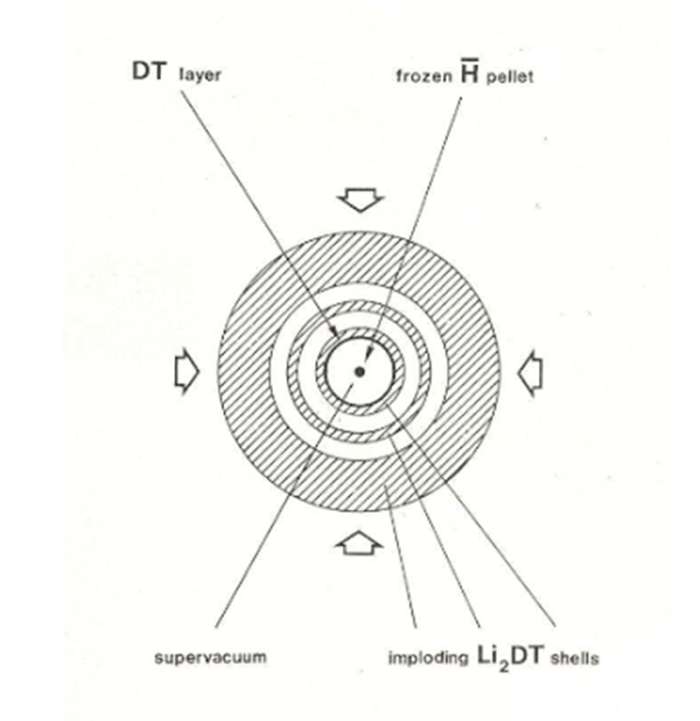 Большие надежды возлагались на ядерные изомеры гафния-178, который способен быть таким мощным источником гамма-излучения, что позволял заменить ядерный триггер. Однако ученые так и не смогли заставить гафний-178 выделять всю свою энергию в одном мощном импульсе. Поэтому на сегодняшний день только антиматерия способна заменить ядерный триггер в водородной бомбе. Однако перед учеными стоят фундаментальные проблемы: получить антиматерию в нужных количествах и, самое главное, хранить ее достаточно долго, так, чтобы данный боеприпас можно было практично и безопасно использовать.![]()