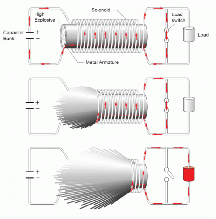 • Под воздействием давления детонационной волны трубка деформируется и становится конусом, который контактирует со спирально намотанной катушкой, уменьшая количество неповоротных витков, сжимая магнитное поле и создавая индуктивный ток.