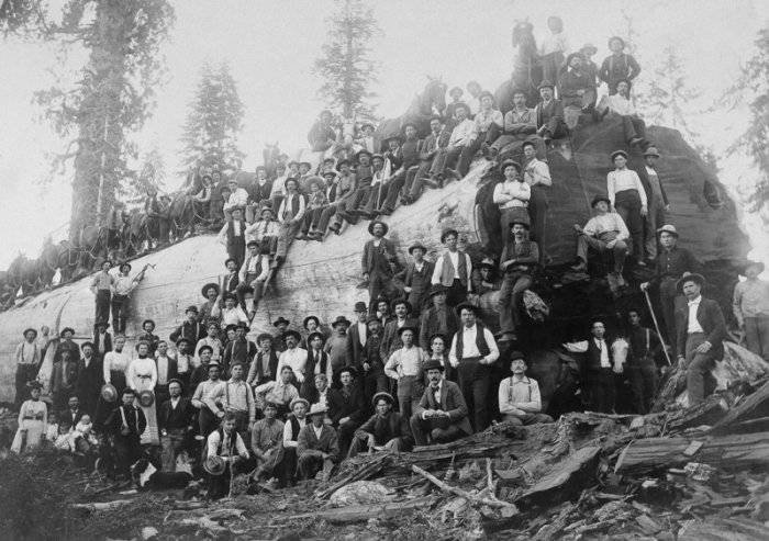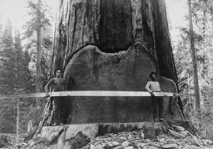 Даже до середины XX века профессия лесоруба оставалась довольно востребованной, а потому многие мужчины с топорами и пилами надолго уходили в леса, чтобы добывать древесину. Несмотря на то, что лесорубы работали при помощи элементарных инструментов, в то время как бензопил еще не было, они валили огромные деревья, размеры которых просто поражают. О непростой работе американских лесорубов в период с 1892 по 1937 год нам расскажут фото из этого поста.