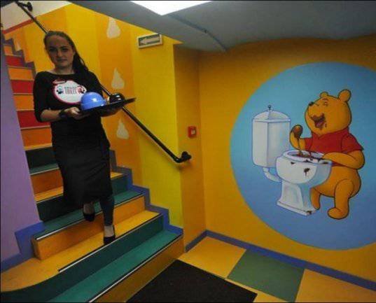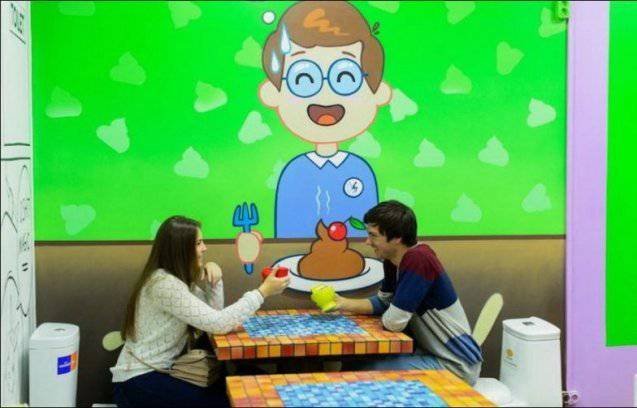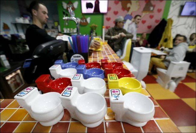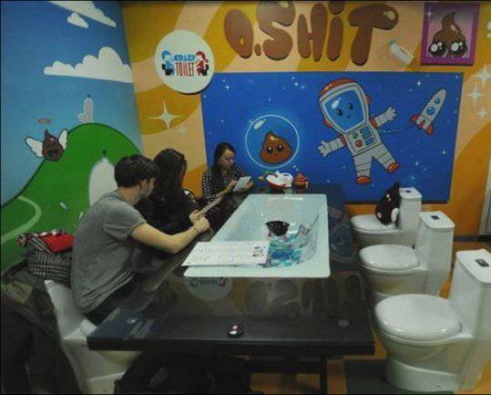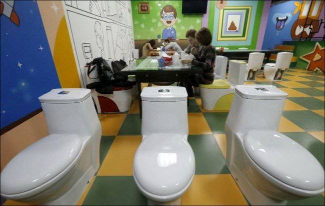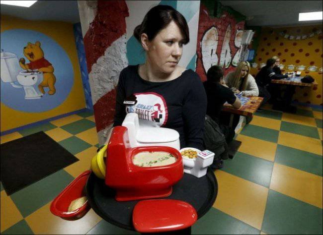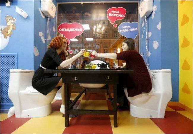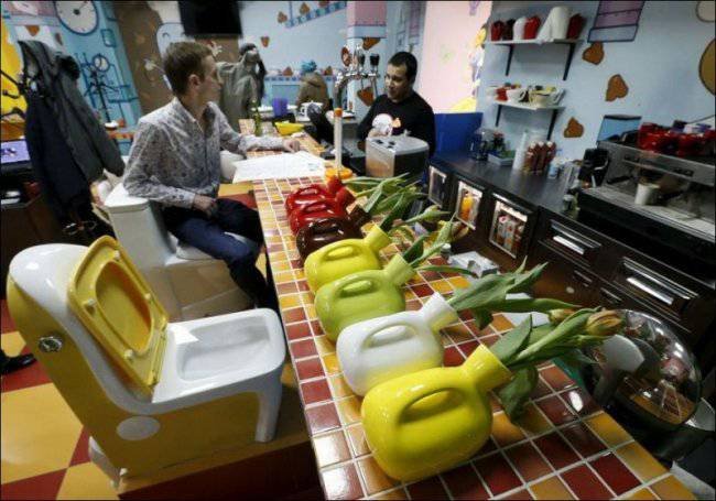 В Москве на Арбате, открылось уникальное, возможно, единственное в своем роде кафе. Кроме восхитительной кухни и необычной подачи это место отличает от всех остальных удивительный интерьер. Само название кафе говорит за себя - "Crazy toilet" - весь стиль кафе заточен под туалетную тематику - здесь и сиденья в виде унитазов, и посуда, и столы и все остальное.